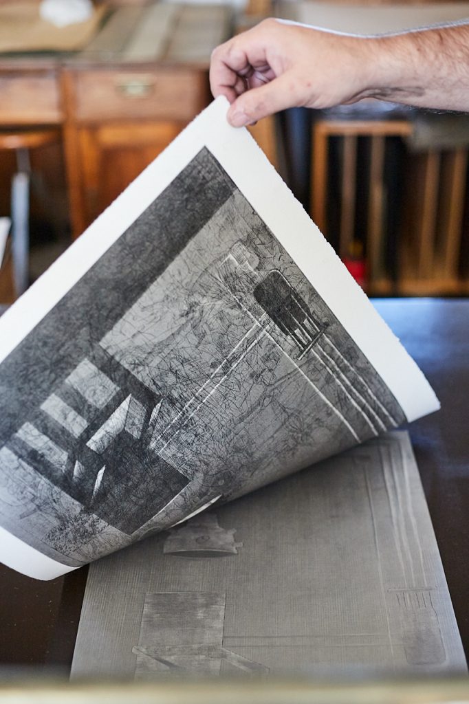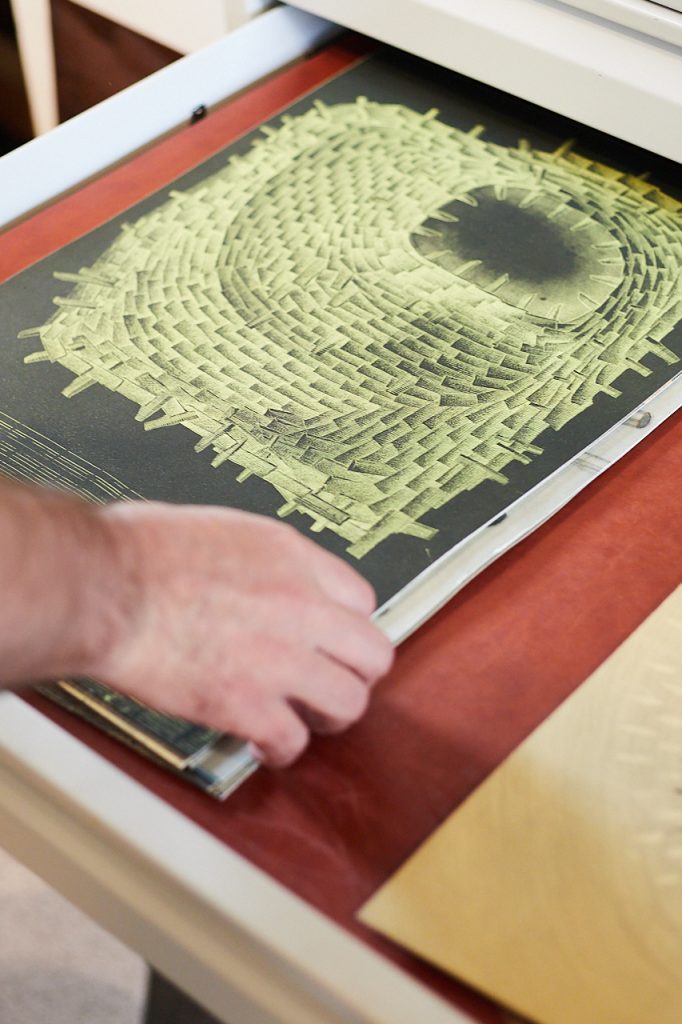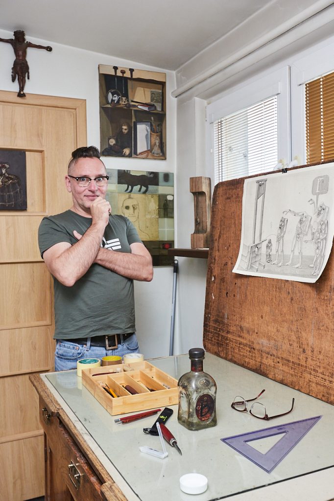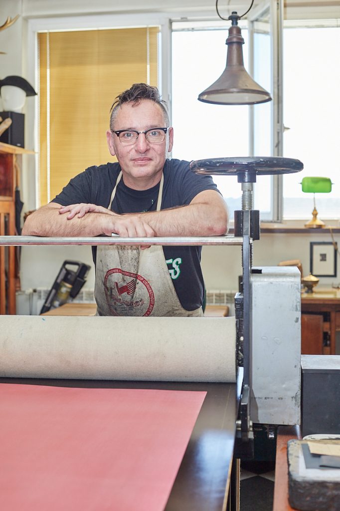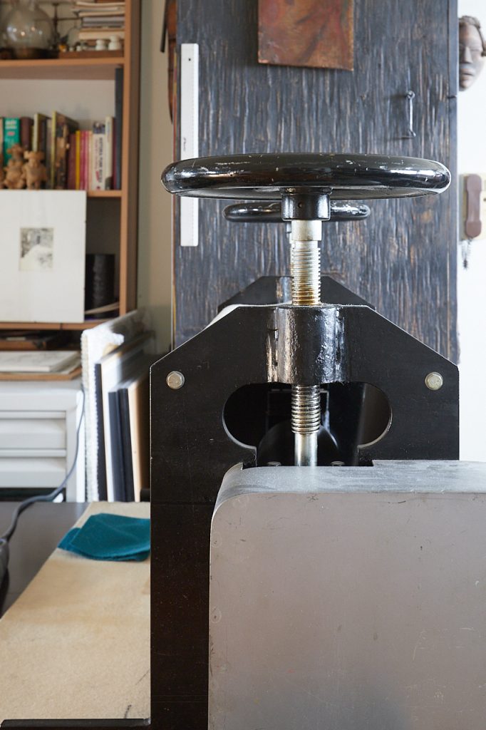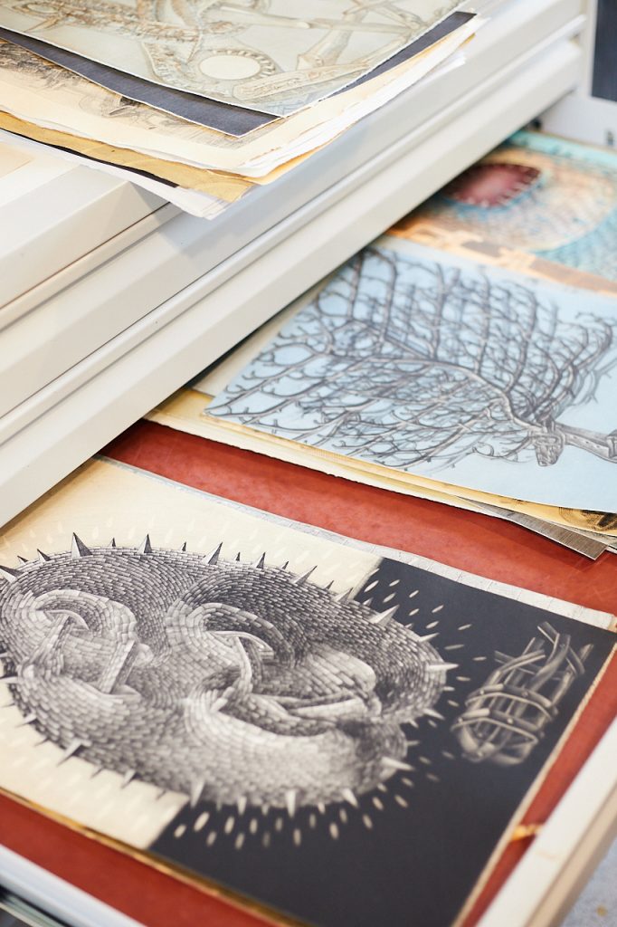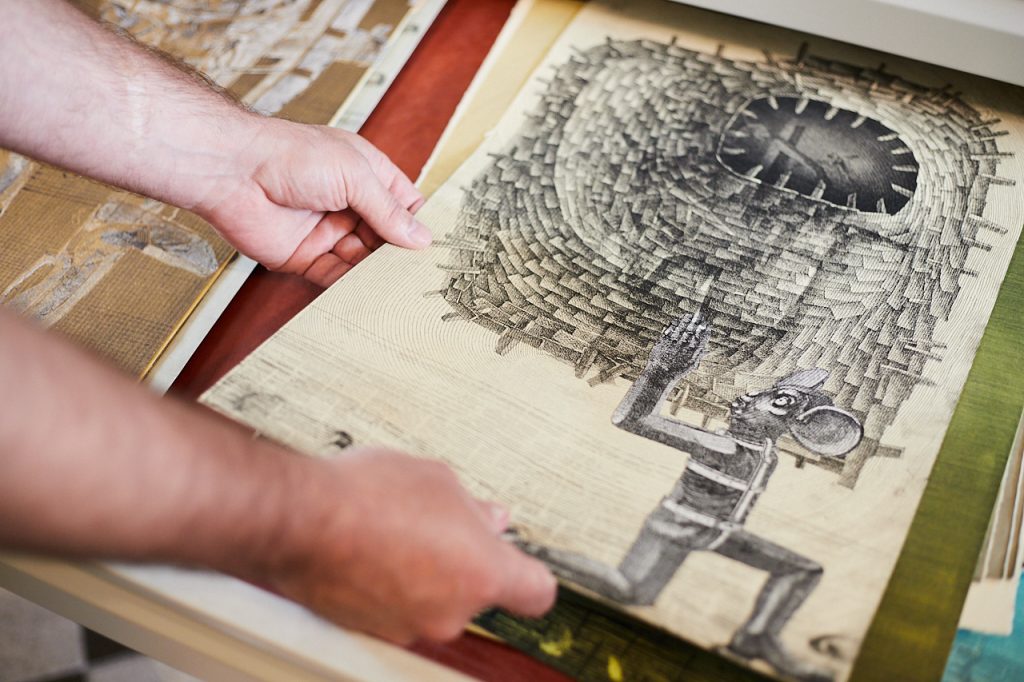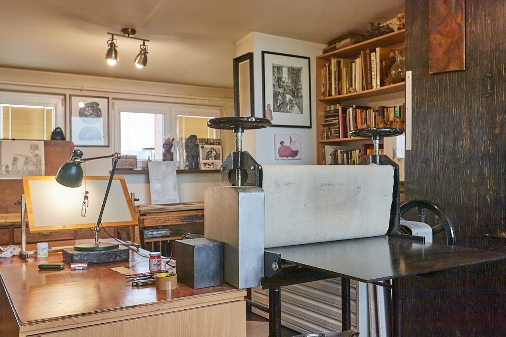 K.B.: Spełnia, bo jest po prostu częścią mnie tak naprawdę. To zawsze była pracownia, najpierw mojego ojca, jak już mówiłem – po prostu lokal przesiąknięty twórczością. I nie wyobrażam sobie nic lepszego. Oczywiście przerobienie pracowni jubilerskiej na graficzną zajęło trochę czasu. Ale mam tutaj swoje wydeptane ścieżki. Bo robota grafika składa się z kilku części. Jedną z nich jest na przykład drukowanie. I mam osobne pomieszczenie, gdzie moczę papier. Są stoły, na których wycieram papiery i wcieram farby w matryce. I nawet obok fotela, na którym teraz siedzisz, jest szyba na biurku, widzisz? Służy mi do wałkowania.