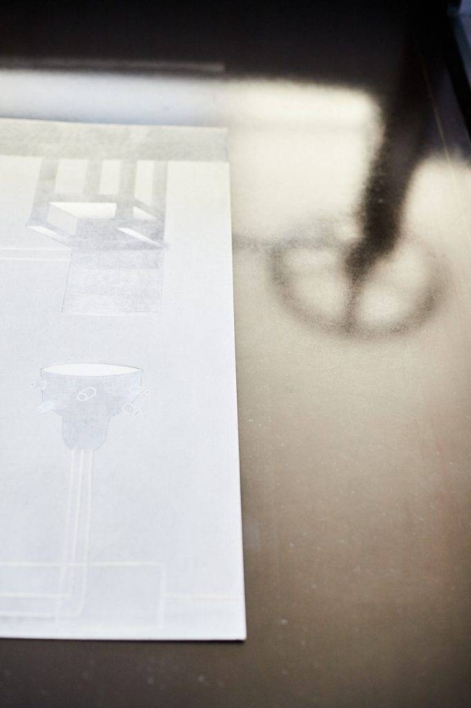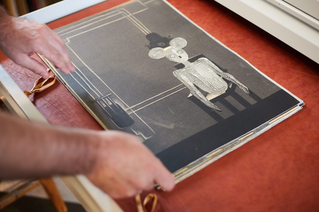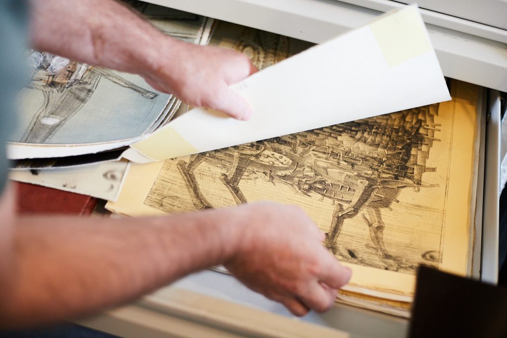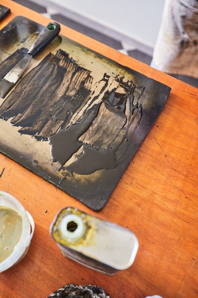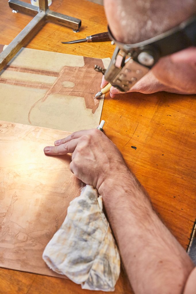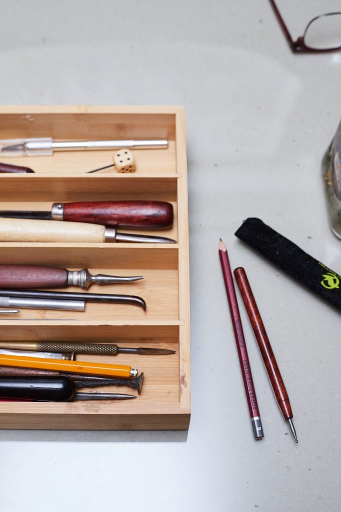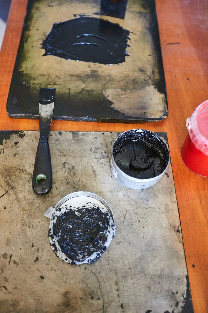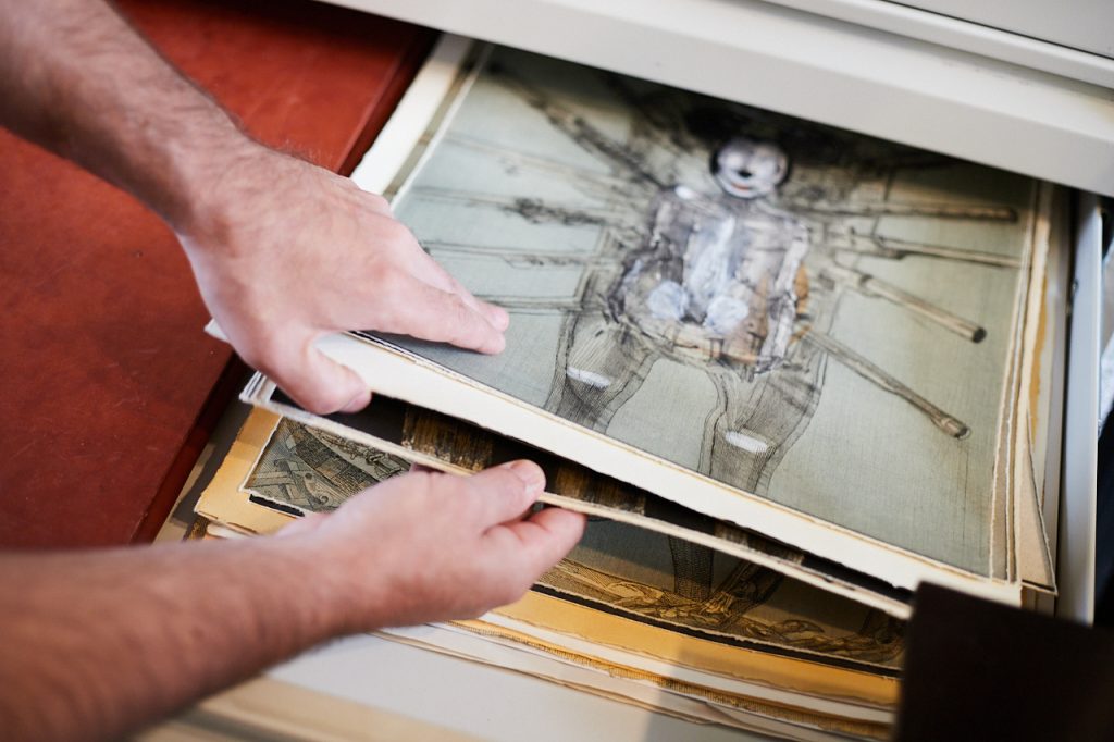 K.B.: Spełnia, bo jest po prostu częścią mnie tak naprawdę. To zawsze była pracownia, najpierw mojego ojca, jak już mówiłem – po prostu lokal przesiąknięty twórczością. I nie wyobrażam sobie nic lepszego. Oczywiście przerobienie pracowni jubilerskiej na graficzną zajęło trochę czasu. Ale mam tutaj swoje wydeptane ścieżki. Bo robota grafika składa się z kilku części. Jedną z nich jest na przykład drukowanie. I mam osobne pomieszczenie, gdzie moczę papier. Są stoły, na których wycieram papiery i wcieram farby w matryce. I nawet obok fotela, na którym teraz siedzisz, jest szyba na biurku, widzisz? Służy mi do wałkowania.
