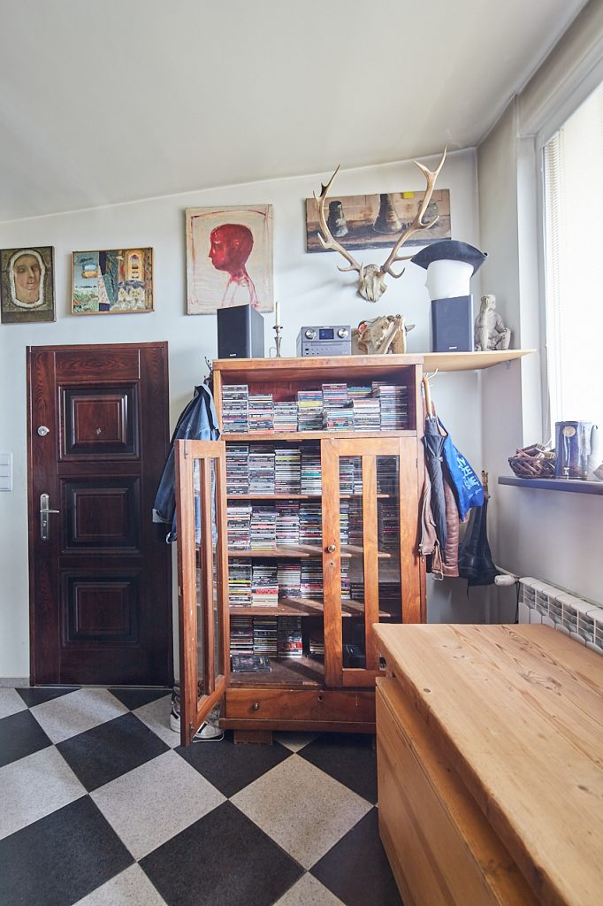 K.B.: Pracowniane rytuały? Moim rytuałem, tam za tobą – jest szafa pełna płyt. Zawsze pracuję przy muzyce, właściwie cisza mnie drażni. Jak wchodzę do pracowni, pierwszą rzeczą, którą robię, jest włączenie muzyki. Sąsiedzi czasami przesyłają SMS-y, żebym się uspokoił. I wtedy trochę ściszam, ale nieznacznie, żeby nie wytrącać się z dobrego nastroju.