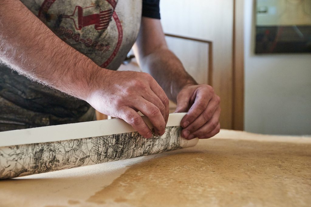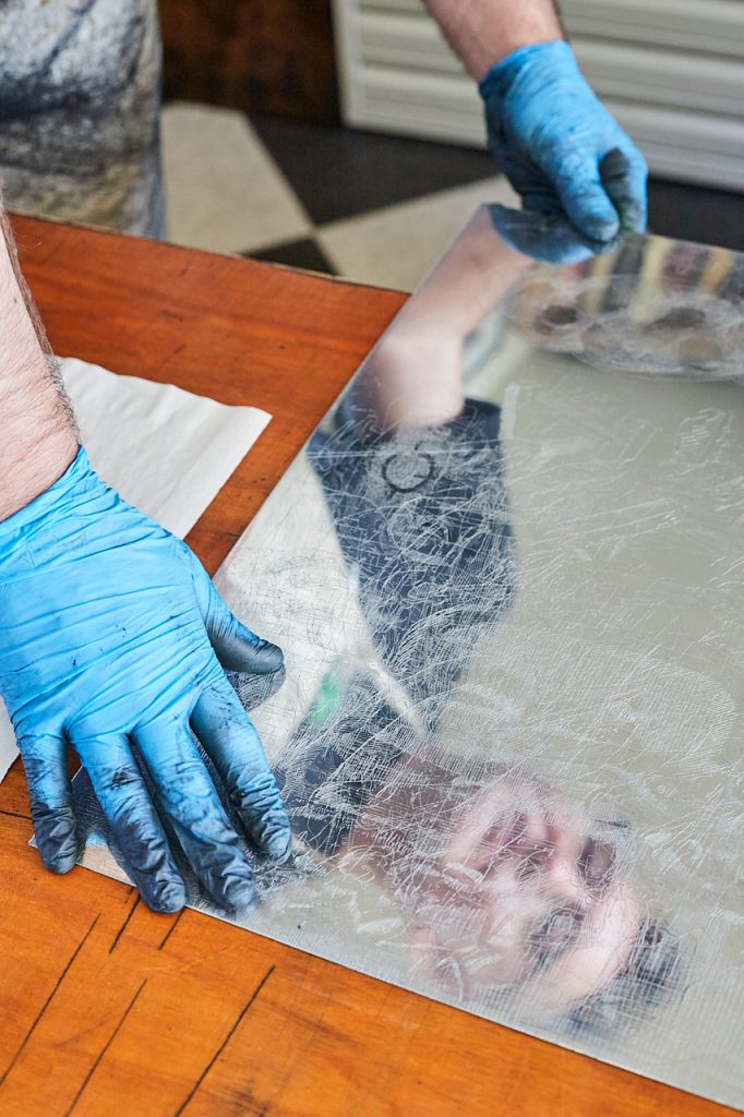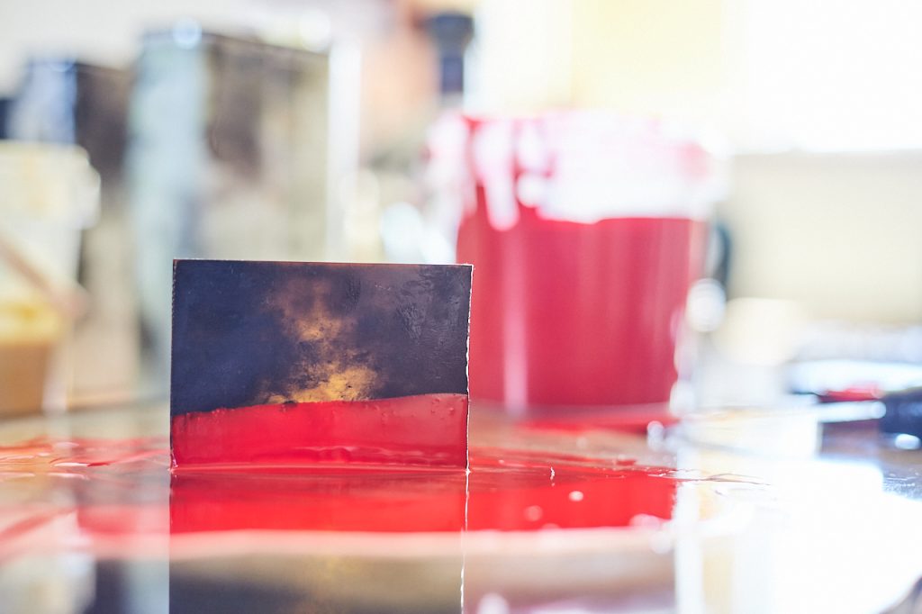 K.B.: Przeszkadzałyby mi, nie mam potrzeby ich nieustannie oglądać. Jedyna moja praca wisi w łazience 😊. Natomiast w pomieszczeniu, w którym moczę papier i trawię blachy, żadnych prac nie trzymam.