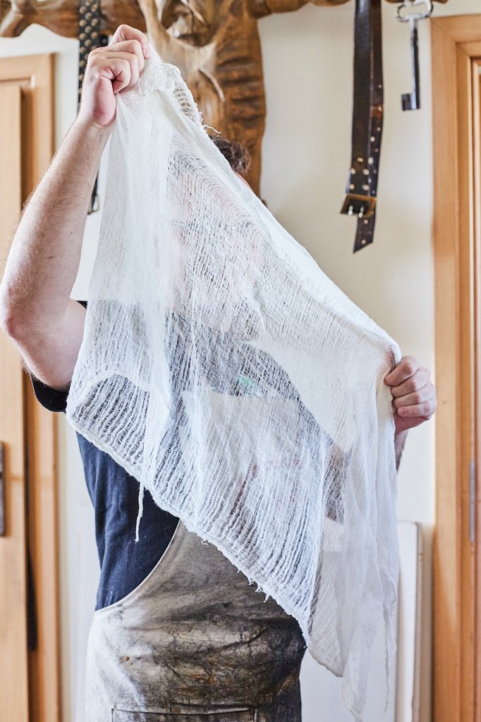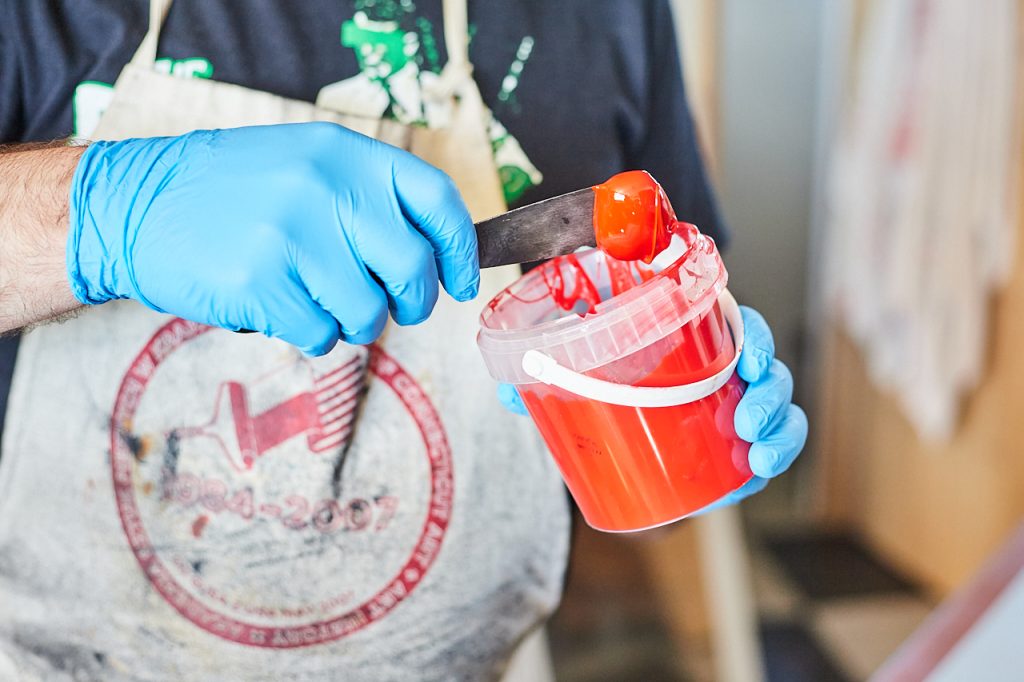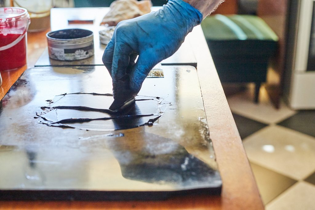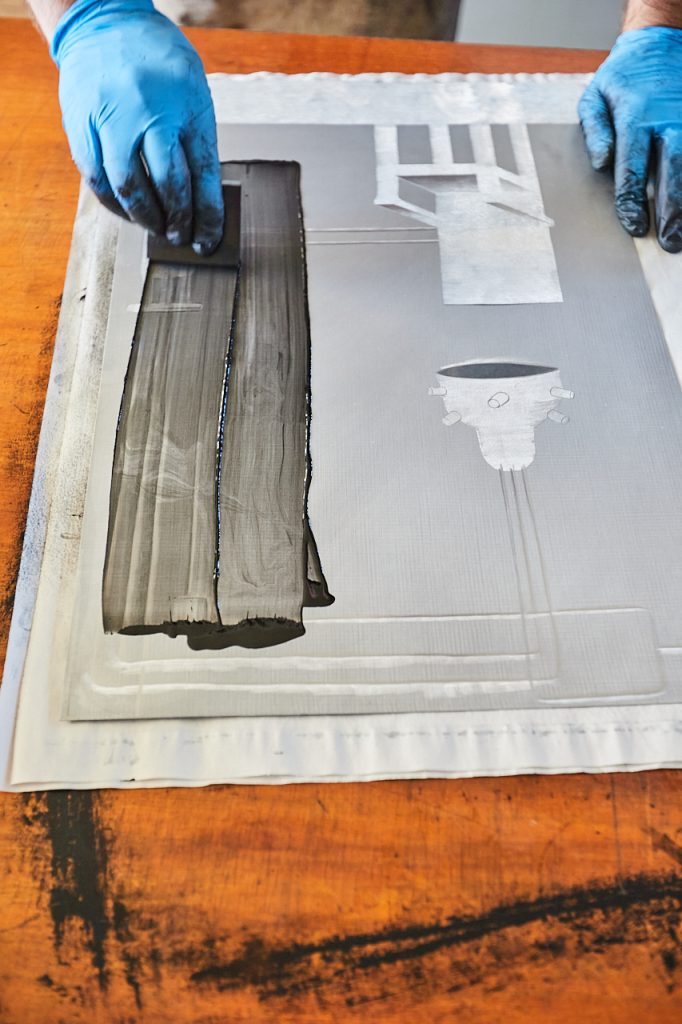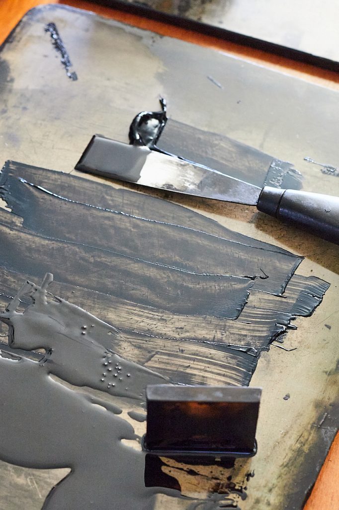 Z kolei akwatinta polega na tym, że używamy jej jakby do budowania obrazu za pomocą plam. Wyobraźmy sobie, że mamy już ten rysunek, na przykład postać narysowaną za pomocą linii, i chcemy, dodać tło. Bierzemy matrycę z tą wytrawioną postacią i wkładamy ją do takiego pudła z ziarnem kalafonii. Zanim wsadzimy blachę, musimy wzbić w tym pudle chmurę tej kalafonii. Jak ta chmura już jest, wsadzamy tam blachę i to ziarno opada w sposób bardzo równomierny, pokrywając całą powierzchnię blachy. Następnie wyciągamy ją ostrożnie z pudła i przytapiamy kalafonię ogniem tak, że każde ziarenko osobno przykleja się do blachy. Zamalowujemy płynnym werniksem wytrawioną postać, która ma pozostać niezmieniona. Następny etap to kolejne trawienie – kwas penetruje blachę pomiędzy ziarnami kalafonii, w efekcie otrzymujemy rysowaną figurę na ciemnym tle.