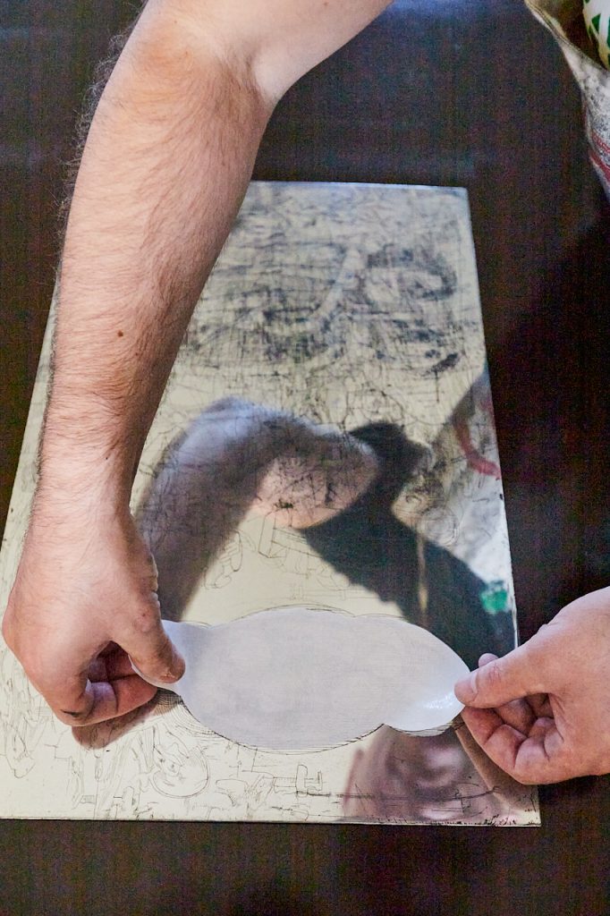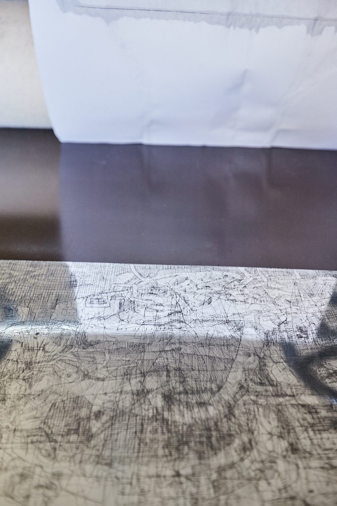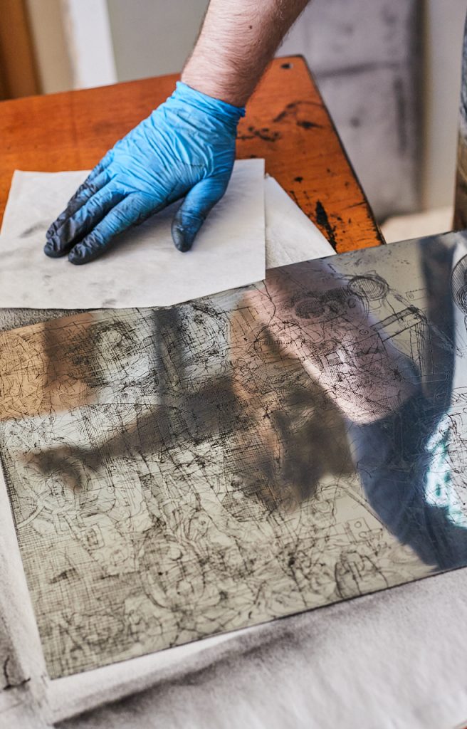 K.B.: Trochę to nie ma sensu, bo w momencie, kiedy ludzie będą czytać naszą rozmowę, to i tak niczego nie zrozumieją, dlatego że to zwyczajnie trzeba pokazywać i zobaczyć na żywo. Krótko mówiąc: akwaforta polega na tym, że pokrywa się cieniutką warstwą czarnego wosku blachę miedzianą lub cynkową. Wosk jest kwasoodporny, nazywany jest werniksem, i bardzo łatwo zarysować go igłą. W związku z tym, jak się narysuje coś na takiej blasze i potem włoży się ją do kwasu, to kwas wyżera te odsłonięte miejsca. Następnie zmywamy werniks i uzyskujemy matrycę, która ma wytrawione rowki w kształcie tego rysunku. Następnie wcieramy farbę w te rowki i pod taką prasą drukujemy na papierze.