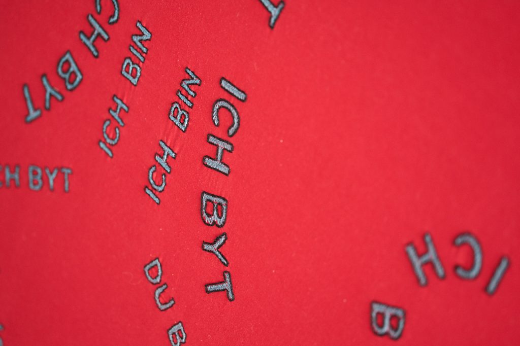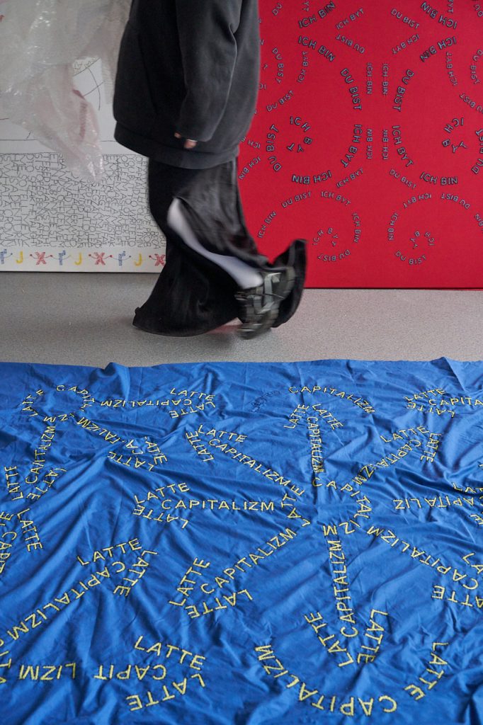 M.N.: A co w takim razie daje Ci powrót do dawnych treści? Widzę tu nowe wielkoformatowe tkaniny z napisami, które już znam: „Ich bin, du bist, ich byt” i „Latte capitalizm” ułożonymi w ornamentalne struktury. Wyglądają zupełnie inaczej niż to, co dotychczas robiłaś, pracując nad dużymi tkaninami, gdzie często stosowałaś obok siebie różne systemy zapisu, rysunki, teksty w różnych językach, symbole. A tu sam tekst, precyzja, porządek.