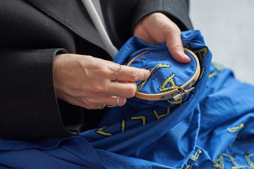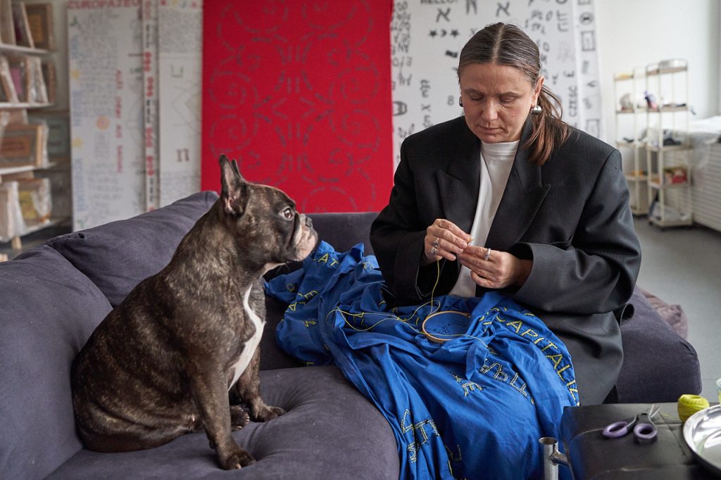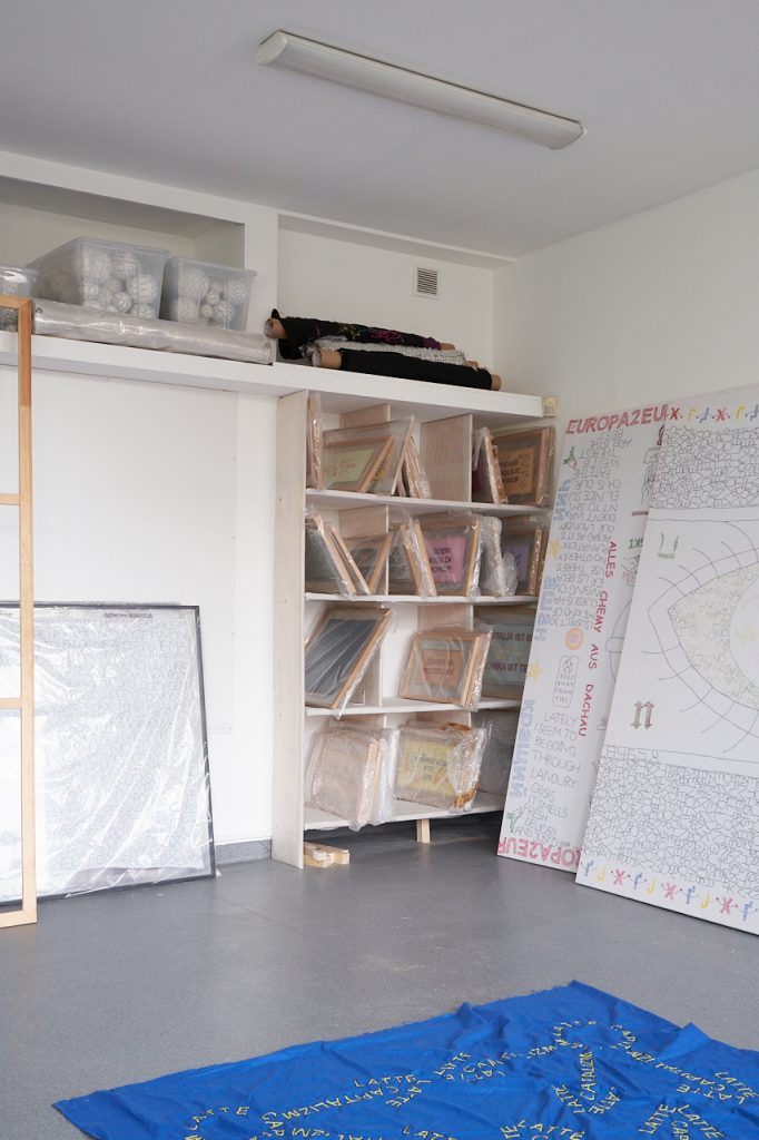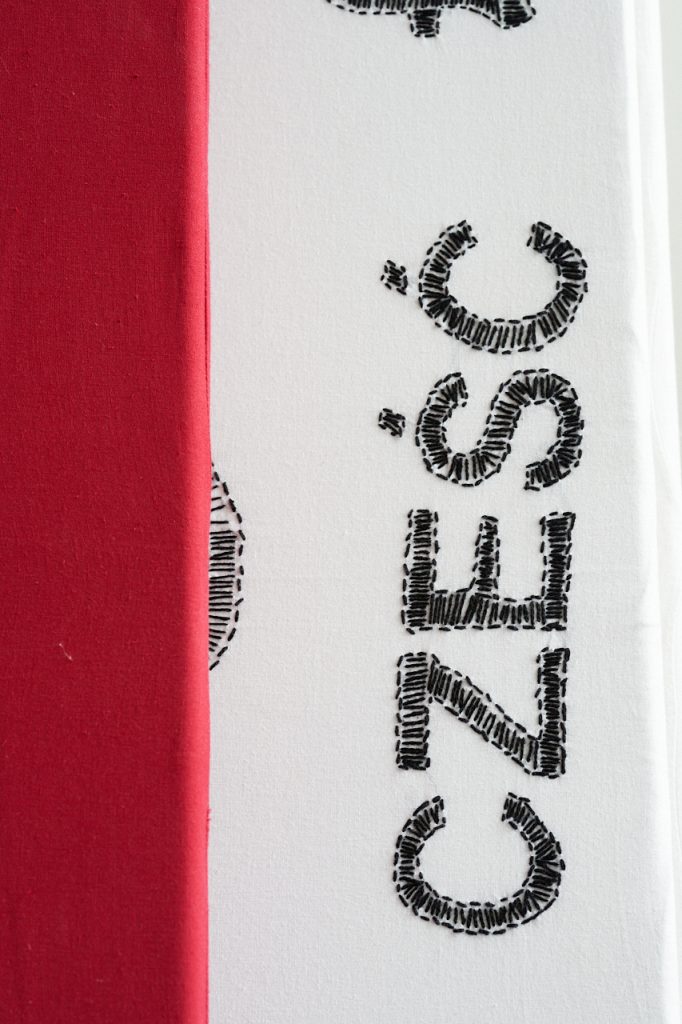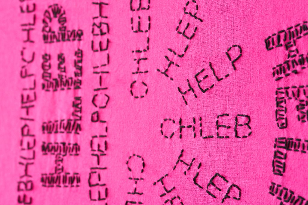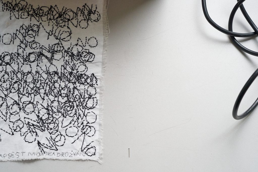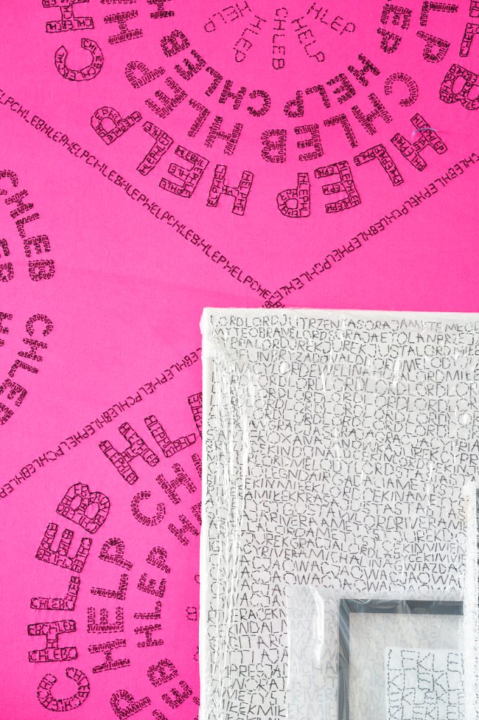 Ale są różne rodzaje haftów – na kolanach masz rodzaj mojej notatki, gdzie w kółko haftowałam słowo „HELLP”, które pojawiło się na flagach dla muzeum Polin. Taki mój szkic, który polega na tym, że milion razy haftuję to samo, powtarzam i powtarzam, aż zaczynam rozumieć, o czym to jest. Bardzo interesujący proces, kiedy się coś tak haftuje w kółko.