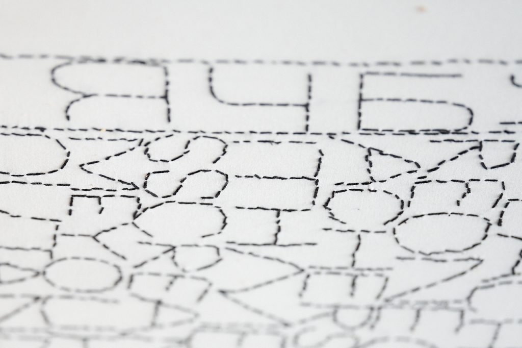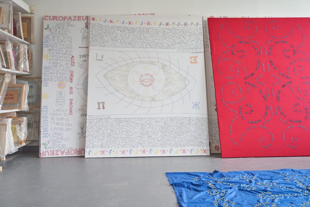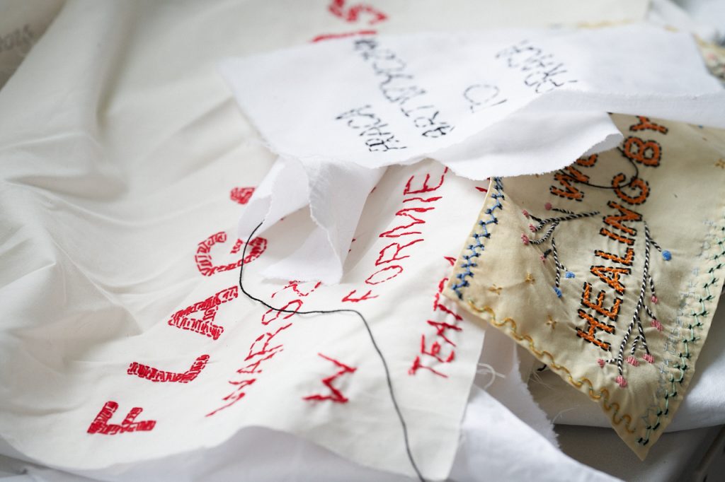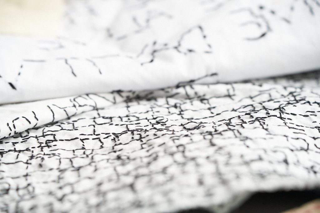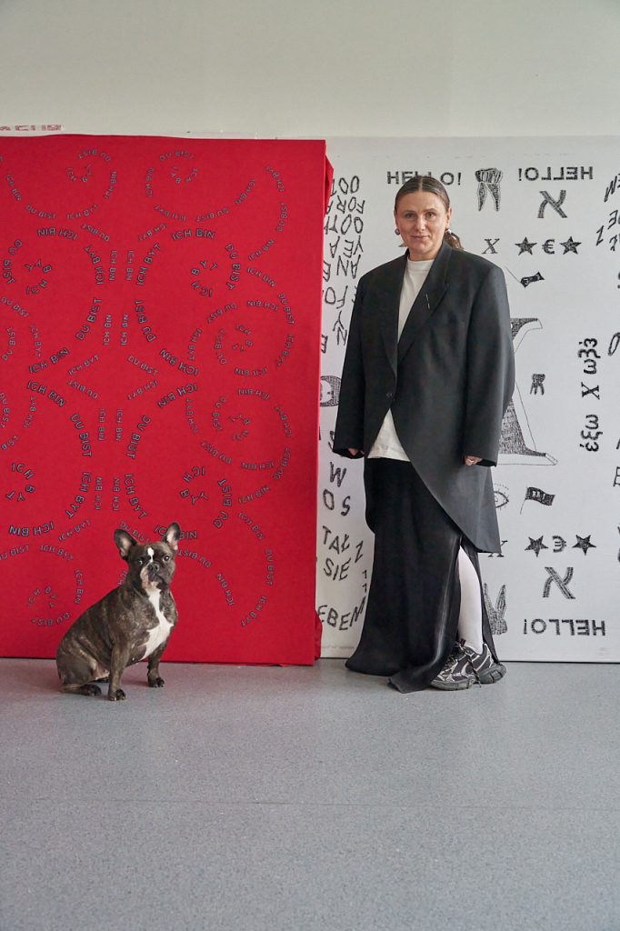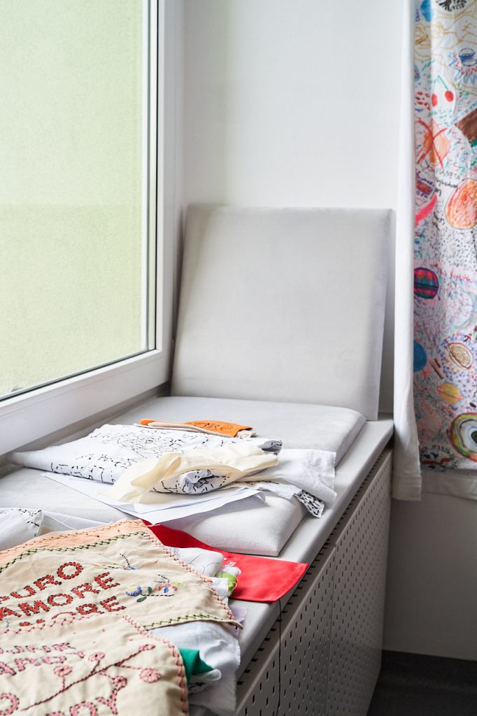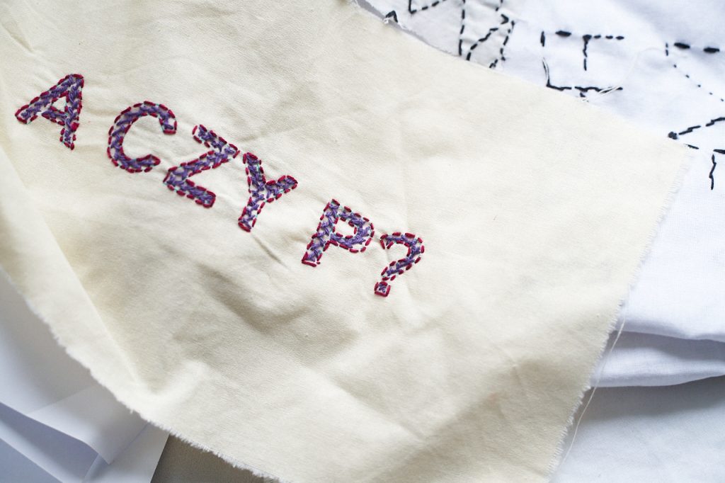 Ale są różne rodzaje haftów – na kolanach masz rodzaj mojej notatki, gdzie w kółko haftowałam słowo „HELLP”, które pojawiło się na flagach dla muzeum Polin. Taki mój szkic, który polega na tym, że milion razy haftuję to samo, powtarzam i powtarzam, aż zaczynam rozumieć, o czym to jest. Bardzo interesujący proces, kiedy się coś tak haftuje w kółko.