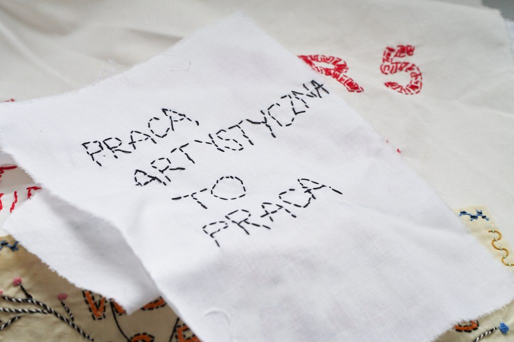 M.N.: W trakcie niedawnej debaty o wynagrodzeniach dla osób artystycznych, która wywiązała się z związku z dołączeniem przez Bunkier Sztuki i MOCAK do porozumienia wypracowanego przez Obywatelskie Forum Sztuki Współczesnej, wizualnym symbolem stał się Twój haft Praca artystyczna to praca. Jak w takim razie oceniasz, ile roboczogodzin zajmuje Ci haftowanie na przykład takiej wielkoformatowej tkaniny?