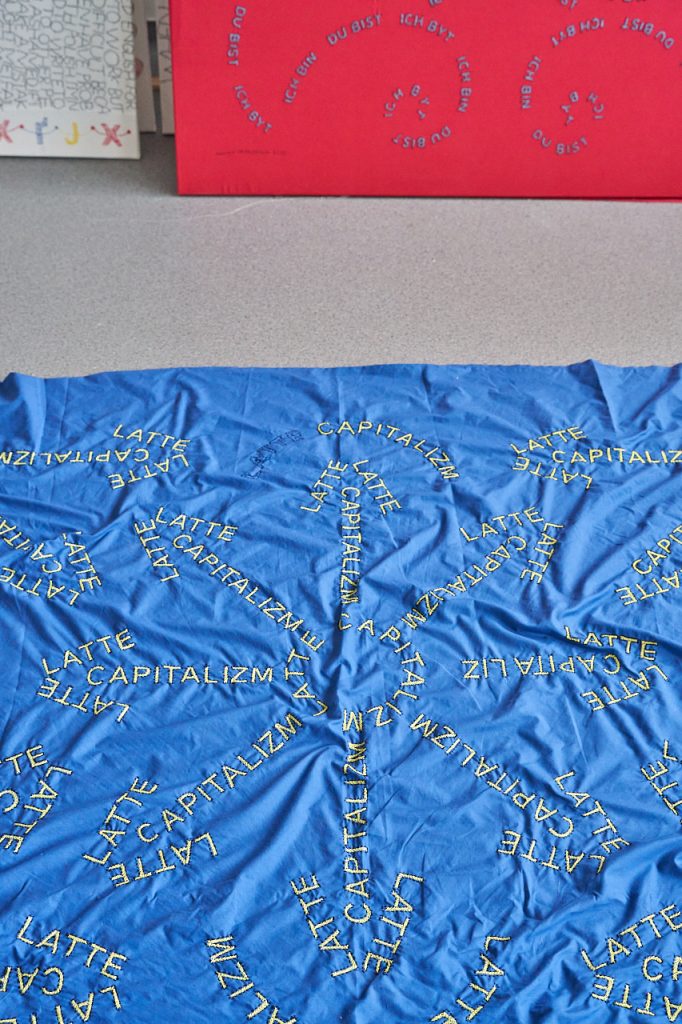 Ale też z każdego takiego powtórzenia wychodzi trochę co innego. Pierwsza wersja tego hasła to był po prostu „latte capitalism”, taka gra z późnym kapitalizmem (late capitalism) i jego wielkomiejską wersją. A w aktualnej wersji to jest praca o kolejnej odsłonie zimnej wojny. Kiedy przygotowywałam ten haft na wystawę w Nowym Jorku, po pełnoskalowej inwazji Rosji na Ukrainę, zamieniłam „s” na „z”, które stało się symbolem rosyjskiej agresji. Z kolei podwójne „t” w tej pracy wiąże się ze zmianami ortografii po II wojnie światowej, z tymi wszystkimi „tt” w nazwiskach zamienianych w zachodniej Polsce na „t”, żeby ukryć tożsamość i uniknąć oskarżeń o niemieckość. Kolejne pokolenie chętnie już do tego „tt” wracało.Więc pojawianie się i znikanie tego „tt” jest związane z przemianami po 1945 roku. A połączenie tego z literą „z” przypomina o nowej odsłonie zimnej wojny, w której żyjemy, czyli wojny de facto chińsko-amerykańskiej. Ale ponieważ ta symbolika jest na pierwszy rzut oka niewidoczna, to latte capitalizm w zasadzie można rozumieć bardzo prosto, jako taki imperialny, wielkomiejski, hiperindywidualistyczny kapitalizm, który nas otacza. Wokół cały czas jest wojna, ale my tej wojny nie czujemy, tylko przelew pijemy.
