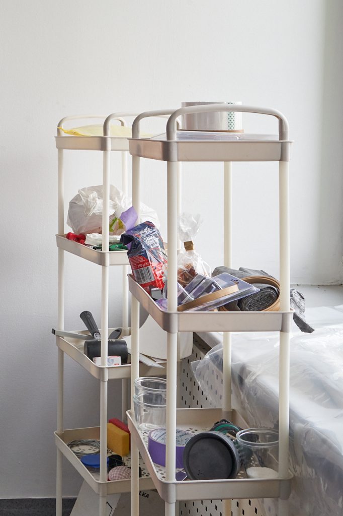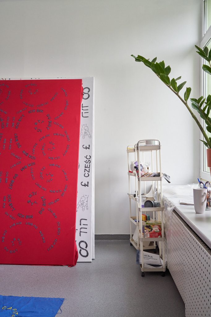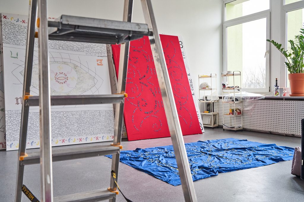 M.D.: To jest moja czwarta pracownia. Wprowadziłam się tu niedawno, bo dopiero w październiku. Pamiętam, jak w 2012 roku wynajmowałam pierwszą w Miraculum na Zabłociu, składaliśmy się po 300 złotych i byłam przerażona kosztami. Potem, z przyczyn oczywistych, przeprowadziliśmy się na Szlak, gdzie znów pracownię dzieliłam z innymi ludźmi. Tamta pracownia była bardziej skupiona na rozwoju Złotych Rączek, czyli szkoły haftu, którą założyłam w 2014 roku, a od 2016 roku prowadziłam razem z moimi uczennicami i uczniami jako Kolektyw Złote Rączki. Długi pokój z długim stołem, dużo ludzi, haftowanie – to miejsce było nastawione na wspólne działanie, a ja przy okazji spotykałam się tam z ludźmi, żeby omawiać wystawy i gdzieś po kątach trzymałam swoje prace. To zresztą w mojej praktyce artystycznej nie była nowość – działania aktywistyczne, społeczne były zawsze jej ważną częścią.