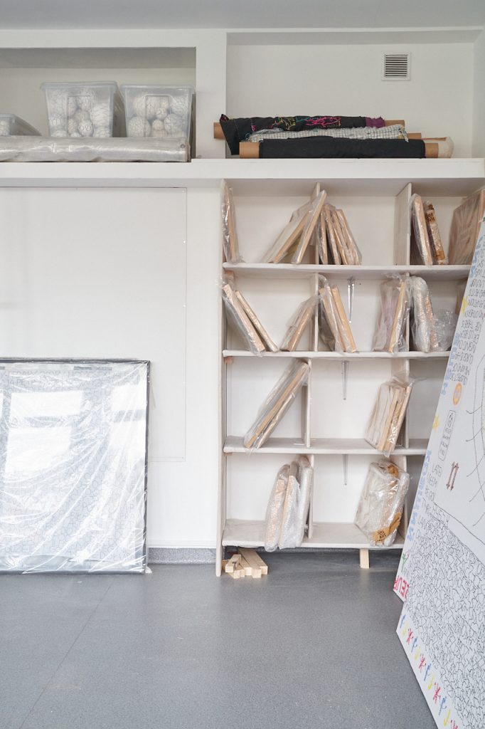 M.D.: Żebyśmy się mogły spotkać! W gruncie rzeczy myślę, że pracownia nie jest mi absolutnie niezbędna do samej pracy nad sztuką, ale potrzebuję jej właśnie do tych pozostałych, okołoartystycznych zadań – i oczywiście jako magazynu. We wcześniejszej pracowni miałam wystarczająco dużo miejsca, żeby rozłożyć duże tkaniny, ale już większość pozostałych prac miałam zawiniętą w folię bąbelkową i kiedy ktoś przychodził wybierać prace na wystawę albo sobie kupić, rozpakowywanie i ponowne pakowanie to była dramatyczna ilość roboty. Dopiero tutaj przełożyłam prace do koszulek, nie kurzą się i jest do nich lepszy dostęp.