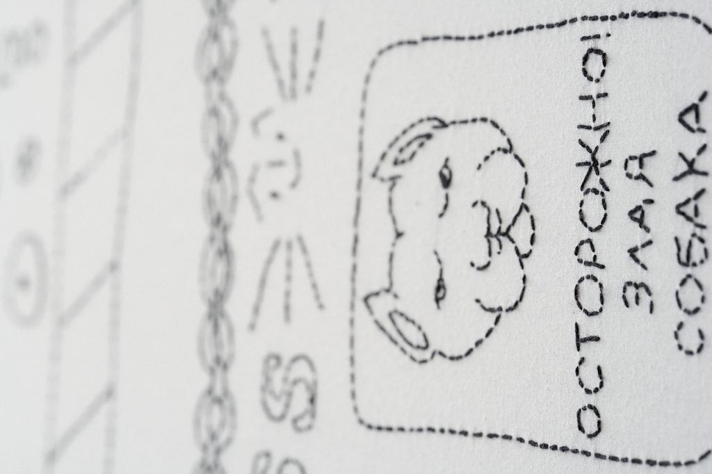 M.D.: Zależy, nad czym pracuję i na jakim jestem etapie. Wiele z moich prac wymaga dużego researchu, nawet jeśli na pierwszy rzut oka nie da się wszystkich znaczeń rozczytać, to ja dobieram znaki i symbole bardzo starannie, sporo czytam i to są często rzeczy trudne, teoretyczne, tu jakieś badania, czyjaś praca doktorska, czasem czytam o tatuażu więziennym, a kiedy indziej o kapitalizmie czy o konstelacjach gwiazd. Czytam i notuję, a potem te notatki zostawiam, wracam do nich po jakimś czasie i sprawdzam, co przetrwało próbę czasu, czy i jak warto to przerobić na ornament. W wypadku tych prac, tych obrusów, zaczynam kompozycję oo środka, wybieram motywy, zastanawiam się, co będzie krawędzią, rysuję i piszę w notesiku, to wszystko trwa. Mija tydzień i cały czas wracam do notatek, od momentu haftowania tego pierwszego fragmentu cały czas procesuję aktualny temat, nad którym pracuję, sprawdzam, co jeszcze warto dodać.