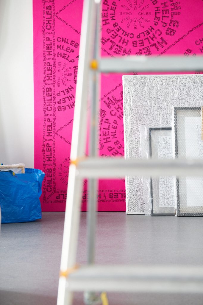 M.D.: Taki właśnie był zamysł. Częścią tego cyklu jest też ta różowa praca, Chleb, z motywem inspirowanym tymi obecnymi na ludowych serwetach, którymi przykrywało się chleb przed wrzuceniem do pieca. Dla mnie coś nowego, bo normalnie dużo czasu poświęcam na research, na myślenie, a tu chciałam użyć czegoś, co już wymyśliłam i po prostu pracować na ornamencie, skupić się na formie. Mam w swoim repertuarze sporo wypracowanych form, które po prostu powtarzam, zmieniając tematykę. A tu, dokonując recyklingu treści, chcę do nich dołożyć kolejną warstwę, związaną z ornamentem. I tak wzór Latte capitalizmu jest oparty na symbolu chaosu, Ich bin, du bist, ich byt na spirali Fibonacciego, Chleb to wspomniana już ludowa serweta.