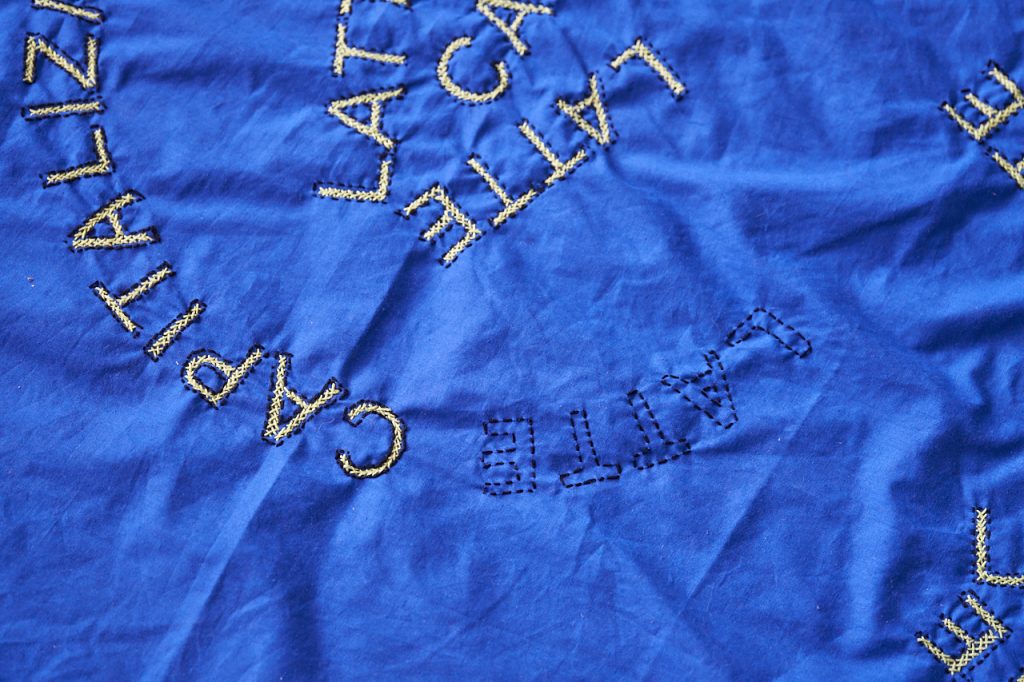 M.D.: Trudno mi na to pytanie odpowiedzieć, bo za każdym razem rzecz wygląda trochę inaczej, a poza tym haftuję właściwie bez przerwy, haftuję, bo mam taką potrzebę. Jak myślę sobie, że chciałabym odpocząć, to zwykle odpoczywając też coś pohaftuję. Haftuję z nudów. Czasem haftuję, kiedy powinnam robić coś innego. Boże Narodzenie też przehaftowałam, bo nie mogłam trafić na dobry serial i pomyślałam: skoro miałabym tylko oglądać coś beznadziejnego, to już pohaftuję. Więc siedziałam w domu na kanapie i haftowałam. Prawie skończyłam tę najnowszą tkaninę, czyli Latte capitalizm. Nie liczę tego czasu, a zresztą haftowanie to tylko część mojej pracy, czasem długo też wymyślam, co powinnam wyhaftować, a czasem kolejne hasła pojawiają się same przy pracy nad czymś innym.